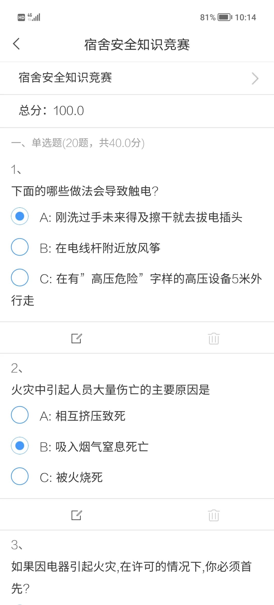 本次宿舍安全知识竞赛以个人形式参赛,采用线上答题方式,从疫情防控、宿舍防火、宿舍安全用电、宿舍生活安全等方面对同学们进行考察。赛前十分钟,各位参赛选手陆续进入学习通,耐心等待比赛开始。答题过程中,同学们自信满满、严守纪律,凭借丰富的知识储备,尽自己最大努力去完成每一道题目,充分体现出机电学子高度的自觉意识与严谨的学习态度。答题结束后,系统自动评卷,即时公布成绩。