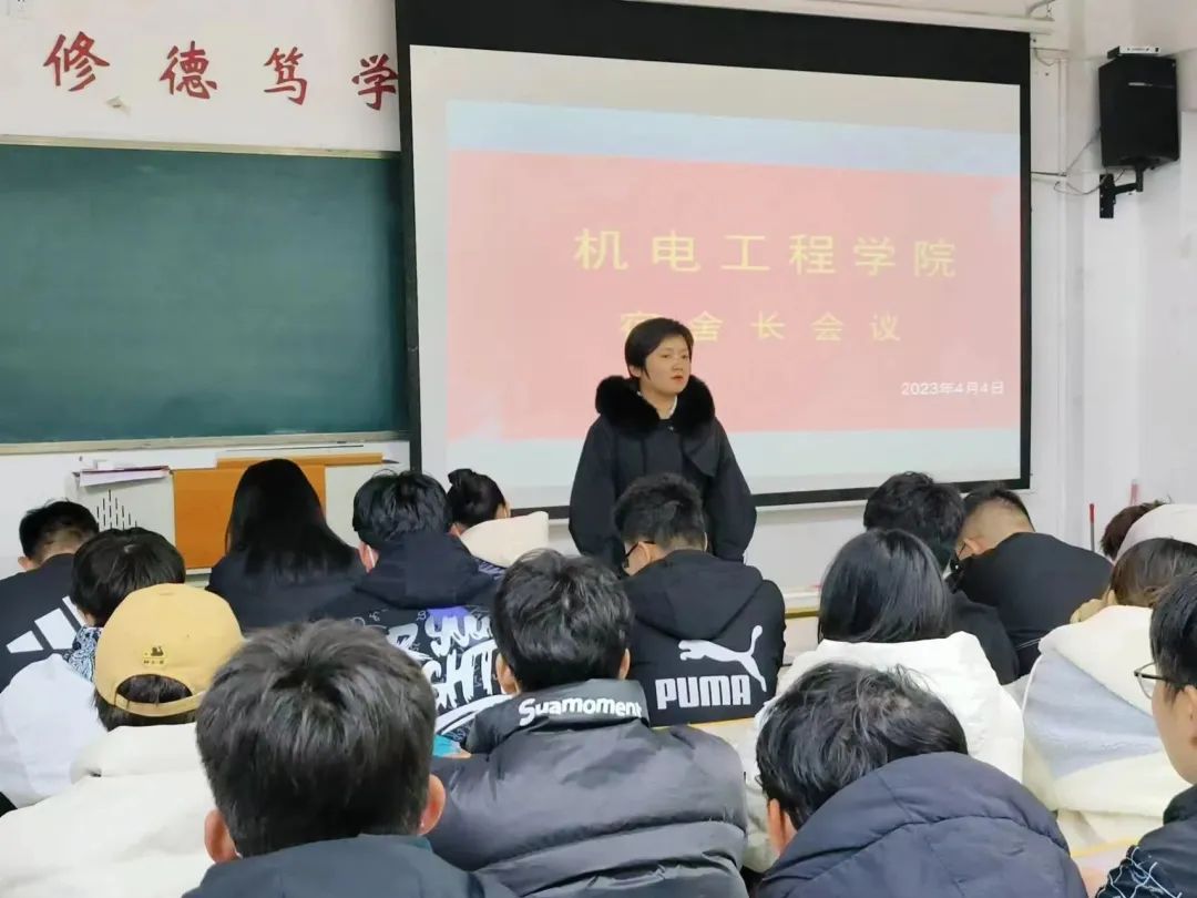 为了加强学生宿舍管理工作,提高宿舍服务质量,为学生创造良好的居住环境。2023年4月4日,我院于机电楼505教室召开了机电工程学院宿舍长会议,学院党委副书记李谨辰,辅导员老师仵晓晗、赵相博、崔肖雪及我院全体宿舍长参加了本次会议。