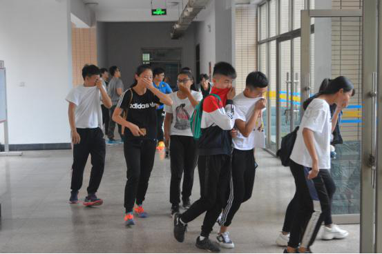 第三个阶段是火灾逃生演练。消防人员在楼下引燃烟幕弹,并拉响警报,参加演练的同学们按照预定路线,捂住口鼻,俯下身子,在工作人员的引导下井然有序地从楼上撤出到指定的安全地点。陈伟老师要求大家提高突发事件的应变能力,防止因应急反应行动组织不力或现场救援工作的无序和混乱而延误事故的应急救援,以有效避免或降低人员伤亡和财产损失,真正落实“预防为主,防消结合”的方针,齐力打造“平安校园”。