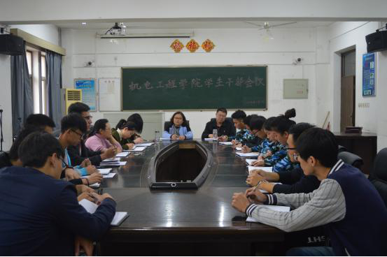 为促进我院学生会各部门工作开展,我院于11月1日下午在机电楼406会议室召开全体学生干部会议。党委书记袁冬梅,党委副书记田丰,辅导员何文娟、孙亚梅、李亚南出席会议,学生会全体学生干部参加,会议由学生会主席王书楠主持。