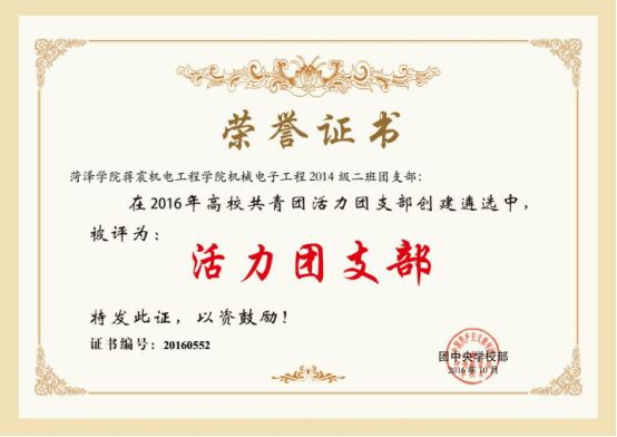 2014年9月,2014级机械电子工程2班紧跟团总支的领导,坚持军训工作与新生入学教育相结合,重视新生养成教育及适应教育,完美完成大一新生进大学后的第一堂课。本班所在连队,严格按照学校军训团的要求,做到严格管理、严格要求、严格训练,依据各项管理手段,增强了同学们的组织纪律观念,培养了同学们“一切行动听指挥”、“令行禁止”的意识,达到训管结合、培养作风的目的。军训结束后得到了参训教官和院领导的一致好评,所在连队被评为优秀连队。在2014-2015学年中,我班举办的周四论坛形式新颖、气氛活跃,各项成绩在全校名列前茅。2014年,2014级机械电子工程2班团支部荣获菏泽学院先进团支部称号,同时在院内举行的各项评比中,2014级机械电子工程2班总是名列前茅,得到蒋震机电工程学院领导的高度赞扬和一致好评。