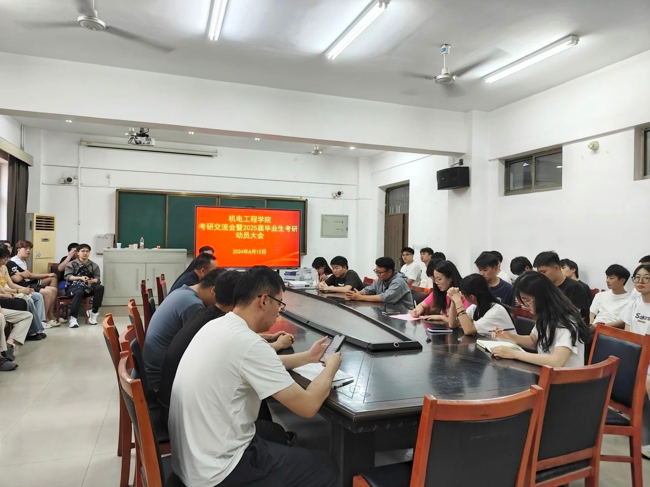 为进一步加强学院学风建设,帮助同学们更好地把握未来的考研形势、明确考研目标、更好地规划未来的学习生活、增强考研的信心与决心,6月12日,机电工程学院于机电楼406教室召开考研交流会暨2025届毕业生考研动员大会,机电工程学院院长江峰,院党委副书记陈凌云,穆国振、李超群、李明聪三位老师,以及辅导员赵相博、邬瑜锦、崔鲁杰出席此次大会。