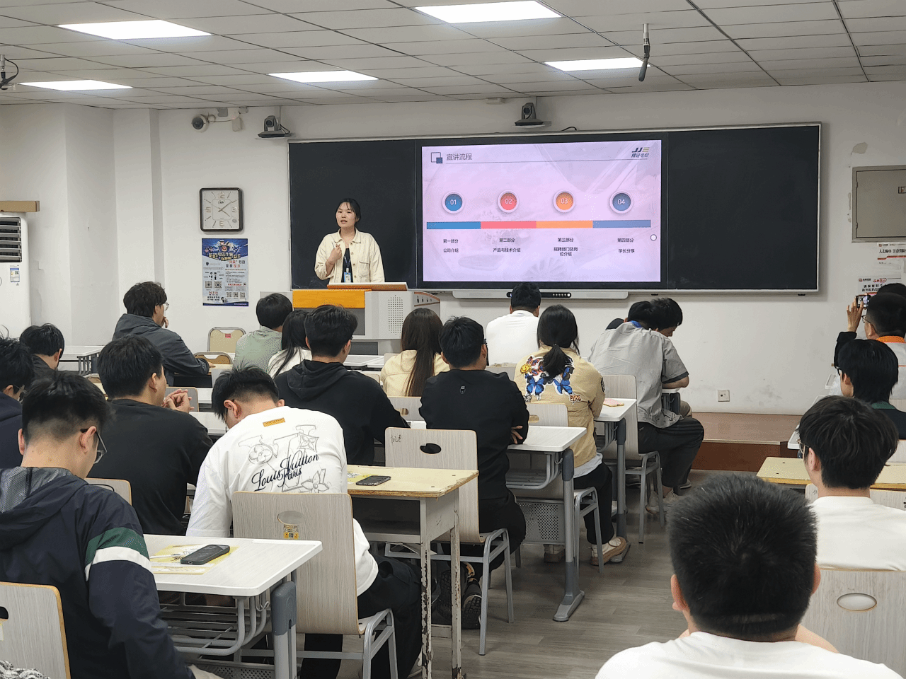 宣讲会伊始,精进电动(菏泽)有限公司的招聘负责人通过3个宣传片向同学们展现了公司的环境和工作氛围,并用生动的PPT全方位介绍了公司的发展历程、业务范围、产品技术以及核心优势,随后,招聘负责人指出了本企业在工厂质量科、总装工艺科等多个领域岗位的人才需求。