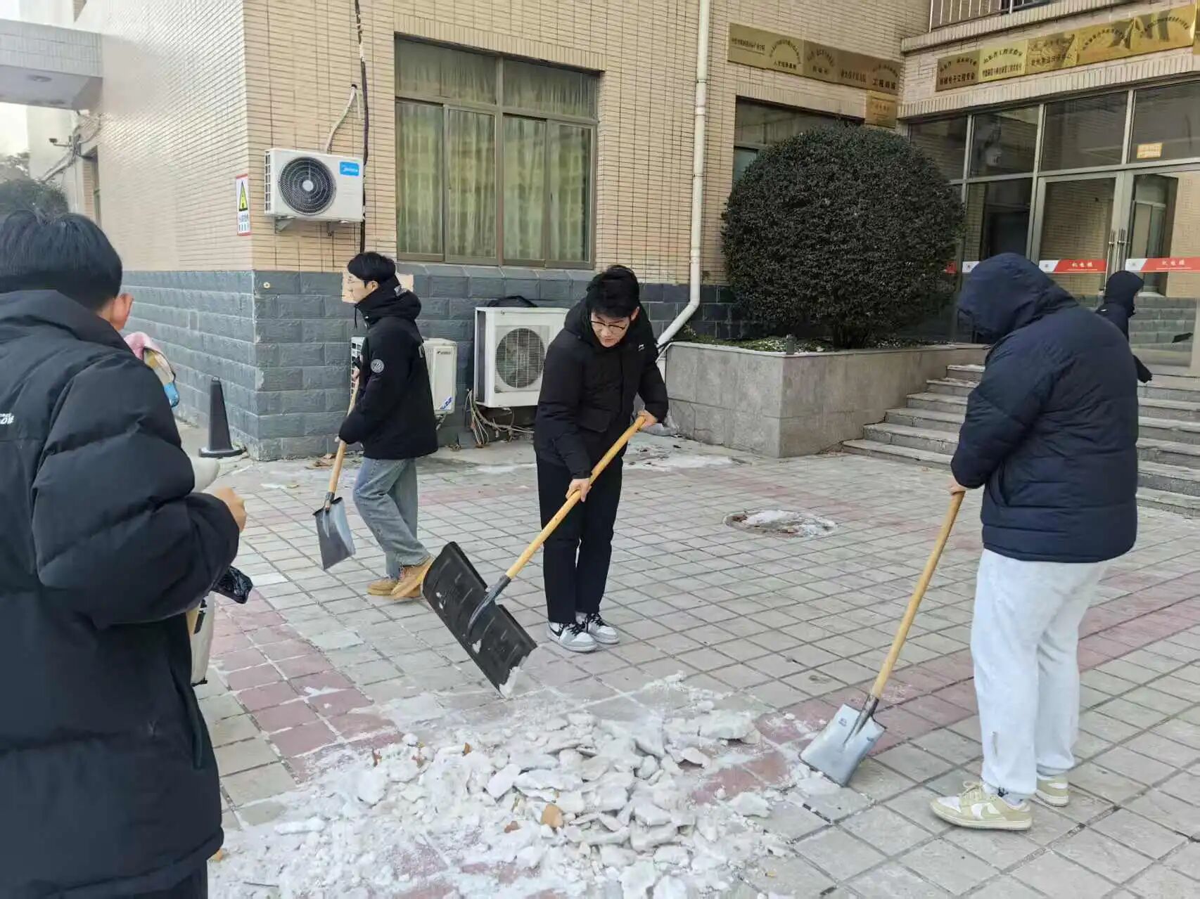 为保障师生出行安全,加强学生的校园责任感,2026年1月20日上午,机电工程学院组织师生在机电楼前开展积雪清扫活动。