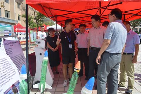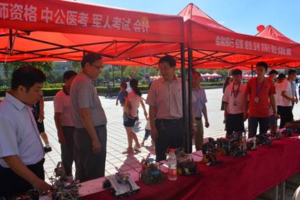 在报到处现场,姜校长看到我院迎新工作台整齐排列,报到流程井然有序,场外引导、资料收集、现场缴费、送宿舍服务环环相扣,志愿者们精神饱满,创新社团活跃在现场,姜校长直言:“你们辛苦了!”。随后,姜校长一行参观了我院向新生展示的科技创新比赛的获奖作品,提出赞扬,他说:机电工程学院把科技创新成果进行宣传,让更多报考的新生与家长看到,这是我们值得学习的,学生和家长最希望了解的是学生在学校到底学到了什么,这种宣传方式值得推广。同时,姜校长针激励我院同学树立目标,取得科技创新更高的成果,并表示学校会为同学们提供更多的实践创新平台。