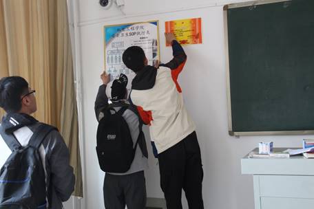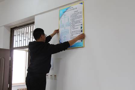 为增强机电楼的环境卫生,提高同学们的卫生文明意识,使美化菏院的行动得到更有效落实。4月8日中午,我院开展安全卫生宣传活动,本次活动的主要内容是由我院劳卫部带领各班、各实验室成员粘贴《安全卫生SOP执行表》。