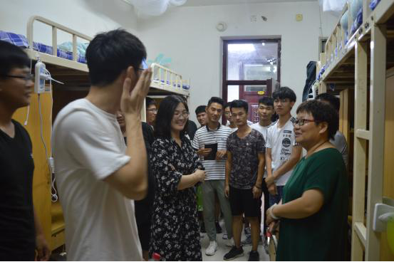 (通讯员 付康)为使我院新生能够更早的适应大学氛围,感受学校的种种温情。9月2日晚,我院党委书记袁冬梅,学生工作办公室主任陈伟,班主任石爽、孙亚梅一行冒雨走访了我院新生寝室,为大一新生送去了问候与关怀。