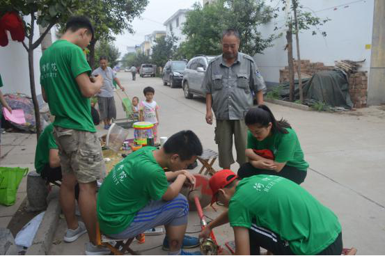 首先,老师和志愿者们携带维修工具来到刘庄新村,在当地行政办事处的支持下,志愿者在其村民委员会门前挂起条幅,安置好工作台,建起家电义务维修站,随后,维修队队长王亚军带领部分队员深入村庄,进行走访、宣传维修工作。在队员们的大力宣传下,需要维修家电的村民都来到家电义务维修站。志愿者们热心接待村民,井然有序地做好维修记录,详细记录下村民的联系方式,以便家电修好后及时联系村民取回。维修队员对故障判断精准,维修技能娴熟,很好的帮助村民们排除了家电故障。现场维修的队员们在检修家电的同时,还给村民们耐心地讲解家电维护小常识。对那些故障家电不方便带到现场的村民们,服务团的队员们为他们进行了住址统计,并及时为其上门服务。