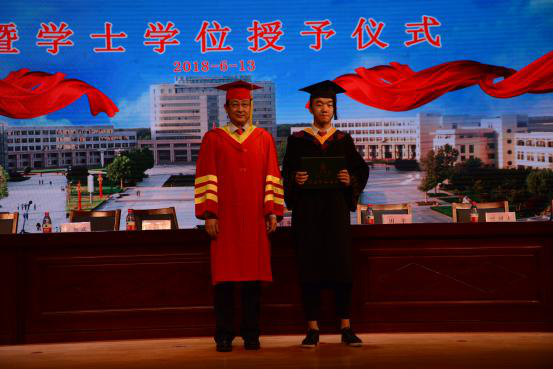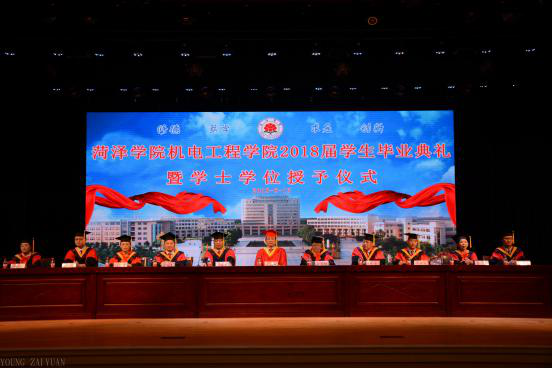 典礼仪式由机电工程学院党委书记袁冬梅主持。上午8:30,在雄壮的国歌声中,2018届学生毕业典礼暨学士学位授予仪式正式开始。首先,毕业生代表任川同学分享了他的大学成就与感悟,他表示要以菏泽学院人特有的姿态,投身社会,服务社会,奉献青春,实现自我,用实际行动报答母校的栽培。教师代表张海英在发言中给毕业生们送上了“不要误解人生,不要丢掉理想,不要辜负时代”的人生建议。接着,机电工程学院院长李振武向2018届毕业生们发表了热情洋溢的毕业典礼祝辞,他向2018届毕业生表示最热烈的祝贺,向辛勤培育同学们成长的老师、无私奉献的家长表示敬意和感谢,并对即将走入社会的毕业生提出了建议。李院长表达了他对毕业生的祝愿,祝愿他们毕业快乐,祝他们在社会的大舞台上,百尺竿头、百炼成钢。同时也希望他们常回母校看看,找寻曾经留下的脚印。最后,伴随着悠扬的歌声,毕业生们在全校师生的祝福和期盼中,意气风发的走上主席台,接受姜同松校长拨穗正冠,从校长姜同松手中接过学位证书并合影留念,为自己四年大学生活划上了圆满的句号。
