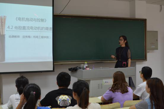 田秀梅老师在活动正式开始之前对学生们的学习态度和听课热情给予了肯定,鼓励大家继续保持饱满的精神状态投身到学习中去,努力研究学习方法,互通有无,共同进步。本次“示范课”说课活动主要由两个环节组成,首先,田秀梅老师以本次示范课内容为例,对备课方法、教案准备、板书设计、重点突出、难点突破以及具体的授课思路进行了讲解。然后,田老师针对《电动机拖动与控制》课程中的“他励直流电动机”这一模块进行了一堂完整的示范课教学,赢得了在场领导老师和同学们的一致认可。