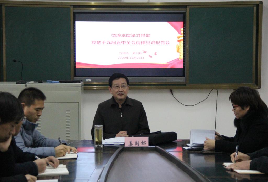 11月26日下午,菏泽学院院长姜同松同志在机电工程学院作学习贯彻党的十九届五中全会精神宣讲报告,机电工程学院及数学与统计学院全体教职工参会,机电工程学院党委书记袁冬梅主持召开会议。