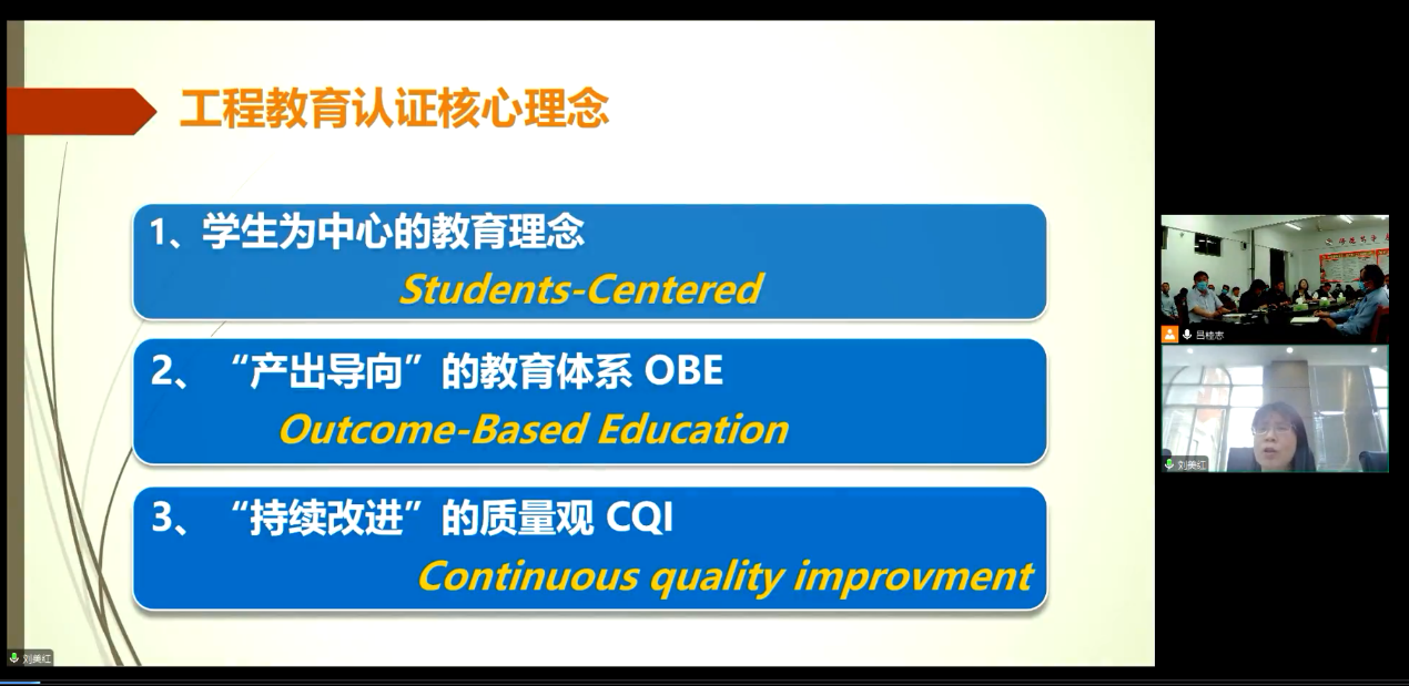 研讨会首先由刘美红教授做了题为“专业认证的核心理念及认证准备工作”的报告。报告介绍了工程教育专业认证的核心理念及专业建设内涵,给出了认证需要详细学习的一些关键文件及相关文件的查询方式,认为工程教育专业认证的准备工作需要整个学院所有部门及教职员工的全员参与。