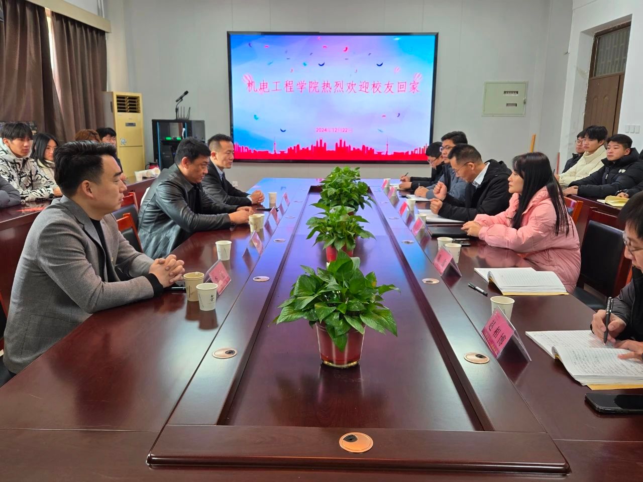 12月22日上午,机电工程学院于机电楼406会议室举办知名校友创新创业教育导师讲座。本次讲座邀请了我院知名校友张子超、李鹏、王斌和李正,机电工程学院院长江峰、党委副书记陈凌云、副院长李忠广、党政办公室主任陈鑫、教学科研办公室主任沈勇、学生工作办公室副主任赵相博,以及学院2023、2024级学生代表参加此次讲座。