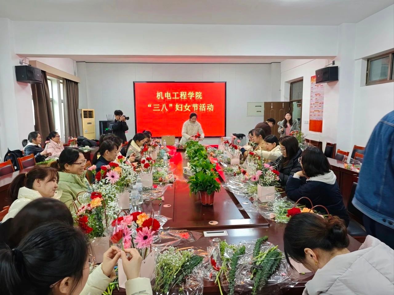 在第115个“三八”国际妇女节到来之际,为关怀学院女性教职工的身心健康,缓解工作压力,丰富校园文化生活,2025年3月6日下午,机电工程学院于机电楼406会议室举办“三八”妇女节插花活动。