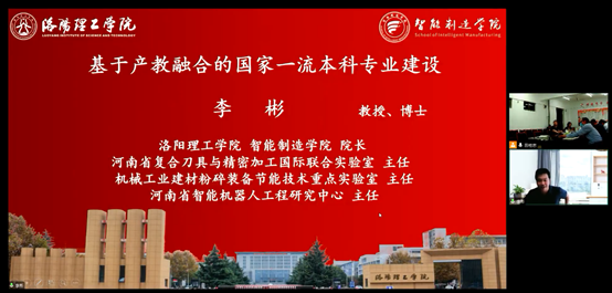 李彬教授做了题为“基于产教融合的国家一流本科专业建设” 的报告。报告介绍了洛阳理工学院智能制造学院情况,陈述了其三个重点学科产教融合情况、各重点学科基础与优势、所取代科技创新成果的推广及应用情况。